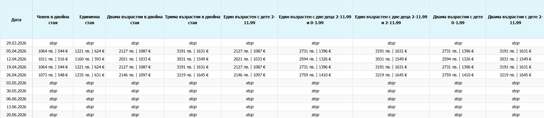 Доплащане за седалка с допълнително място за крака от среден ред - 20 лева / 10 евро в посока.