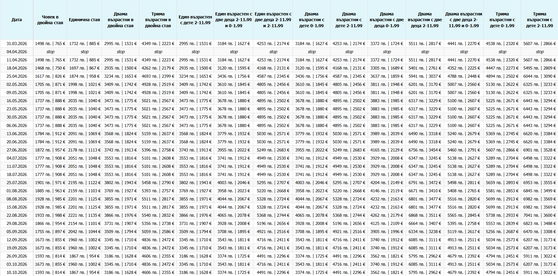 Цена за възрастен 168 BGN | 85 EUR