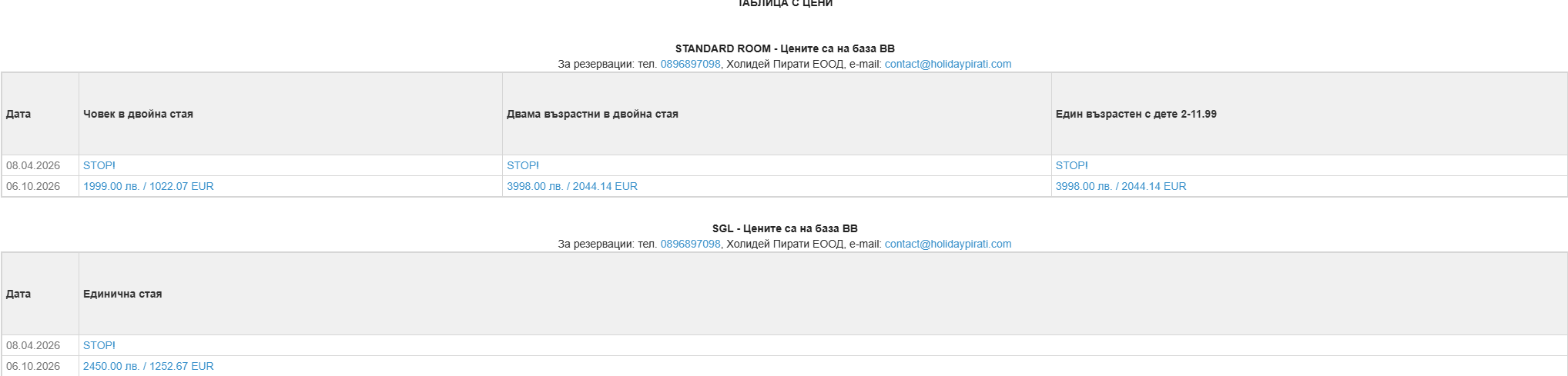 Курортна такса – 2-4 евро/ден/човек, заплаща се на място на рецепция;
