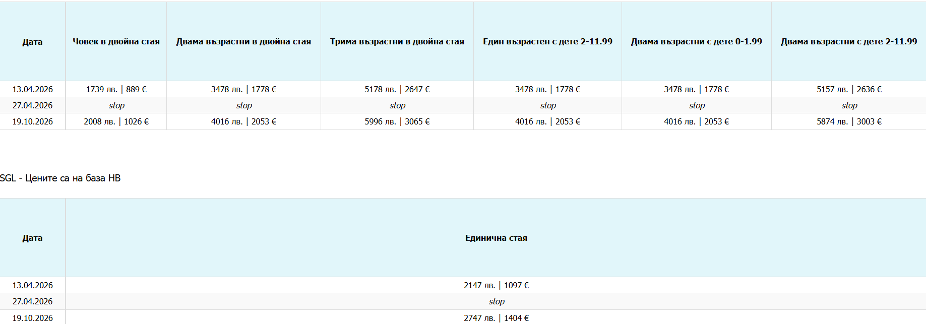 До 30 дни преди тръгване 50 лв такса анулация на човек