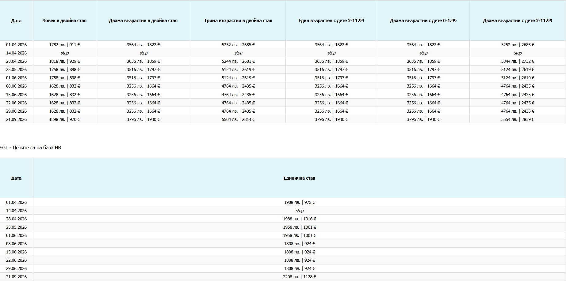 Доплащане за седалка с допълнително място за крака от среден ред - 20 лева / 10 евро в посока.